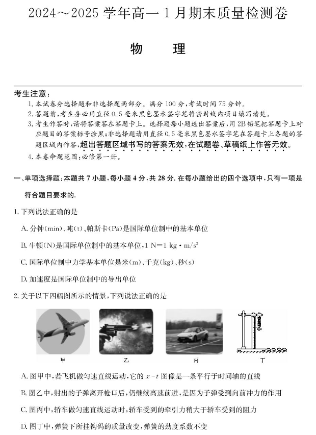 山西省2024-2025学年上学期1月高一期末质量检测物理+答案
