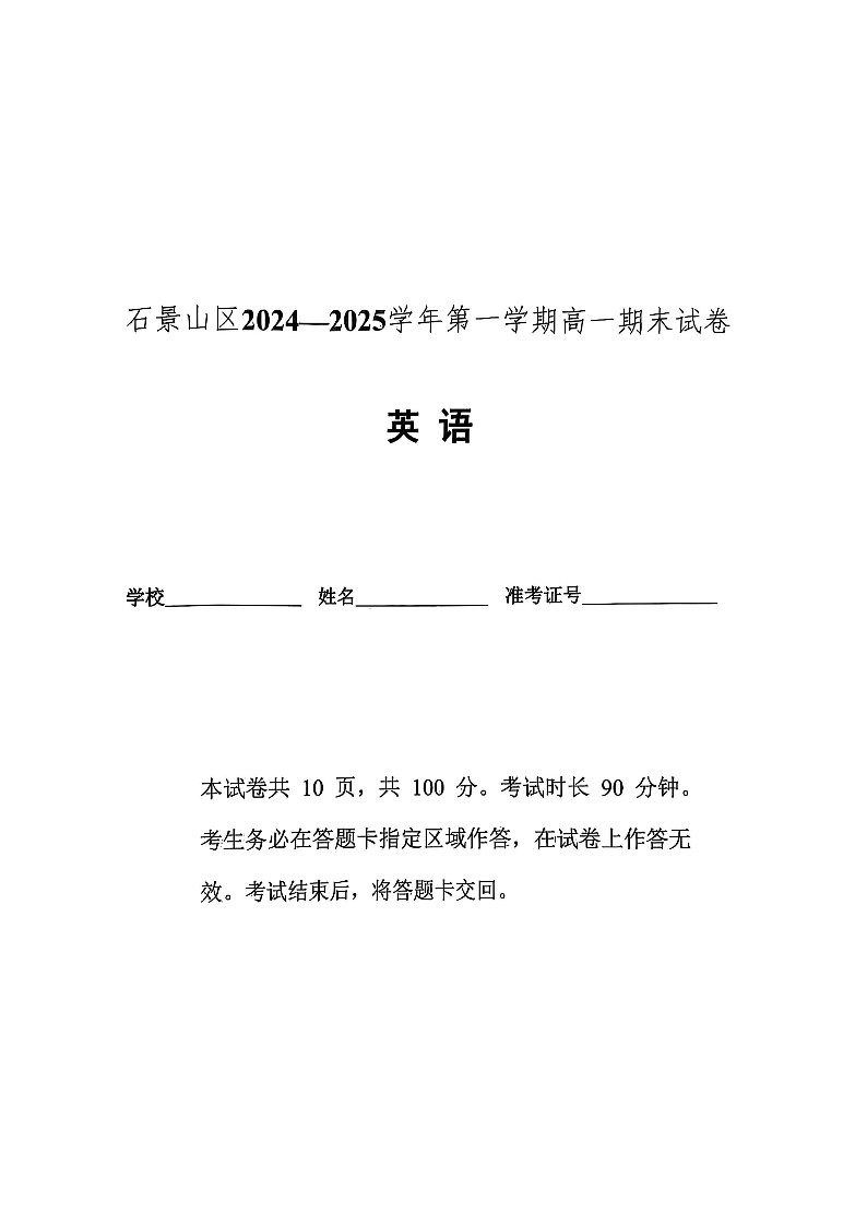 北京市石景山区2024-2025学年上学期高一期末考试英语