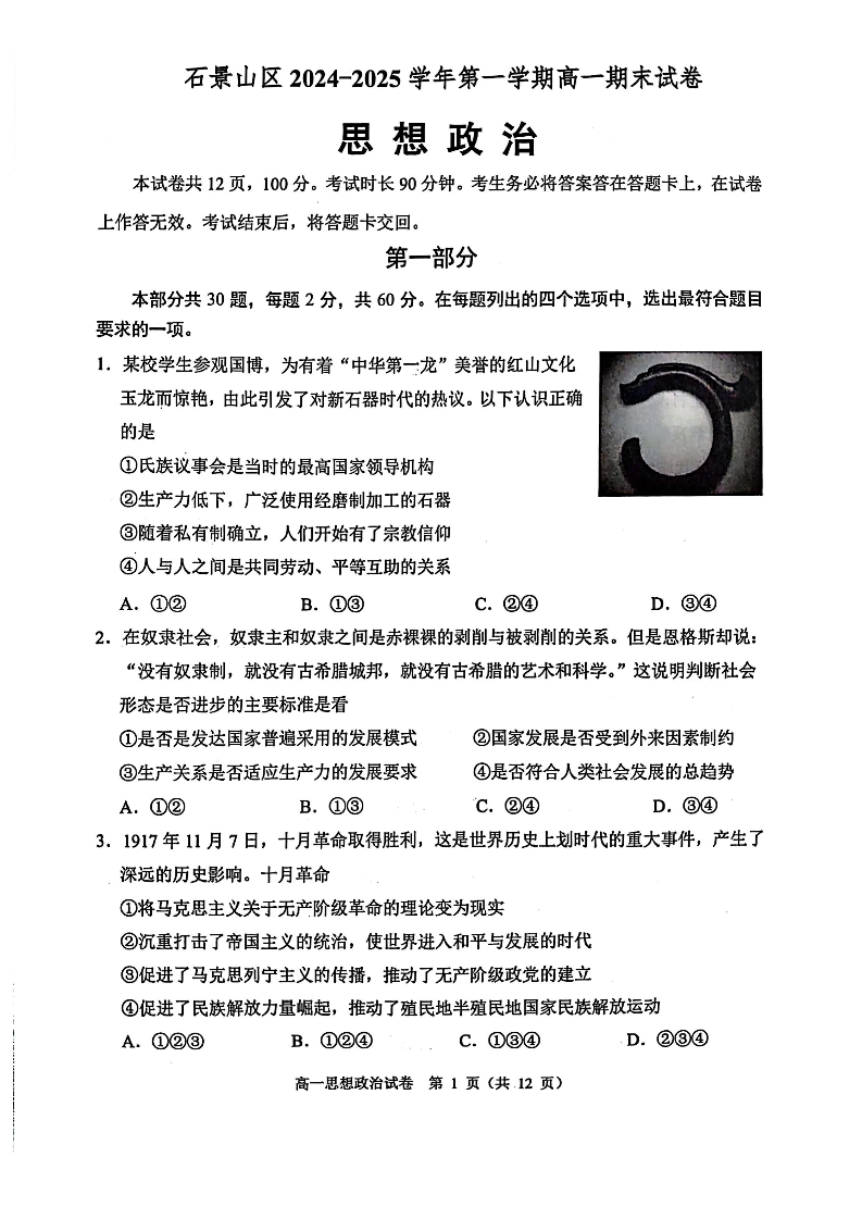 北京市石景山区2024-2025学年上学期高一期末考试政治+答案