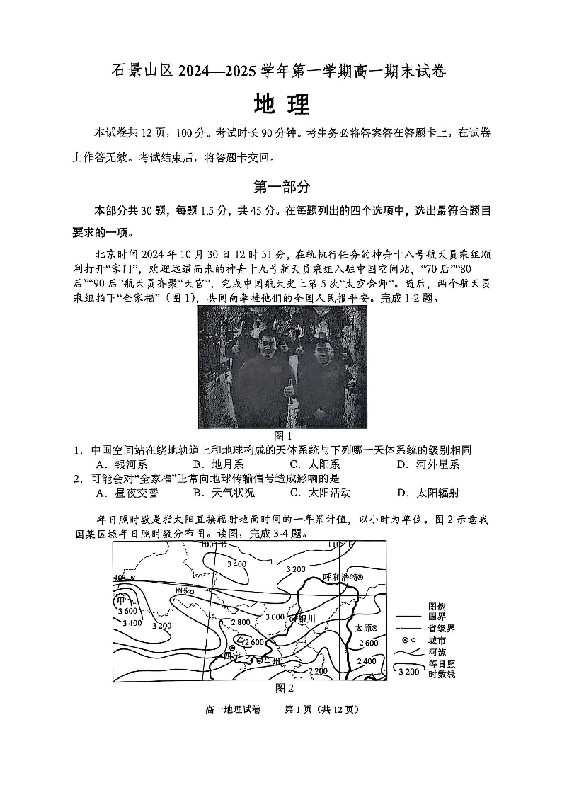 北京市石景山区2024-2025学年上学期高一期末考试地理+答案