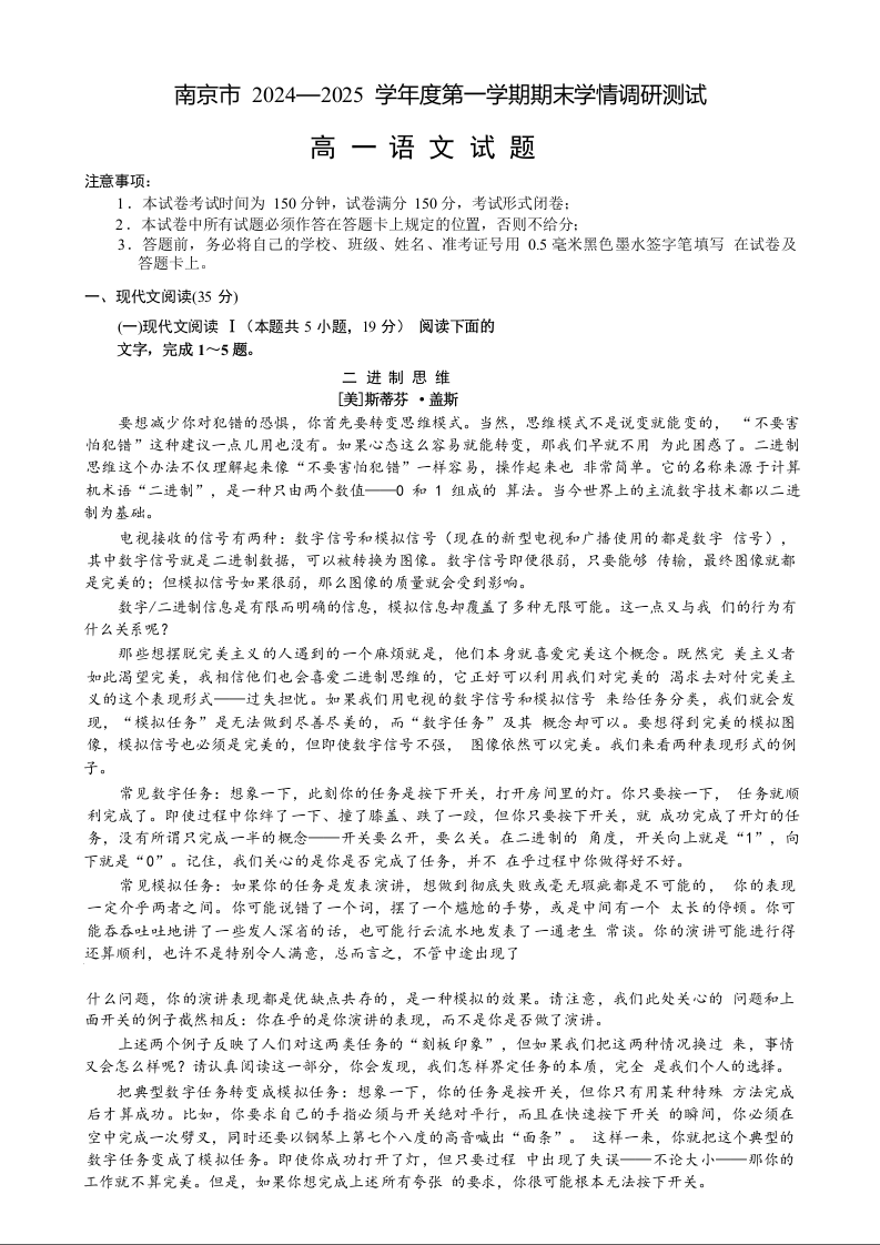 江苏省南京市2024-2025学年上学期1月高一期末考试语文+答案
