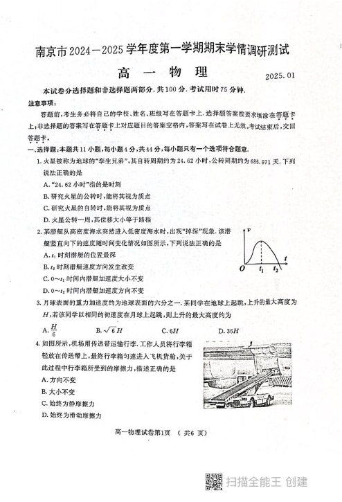 江苏省南京市2024-2025学年上学期1月高一期末考试物理