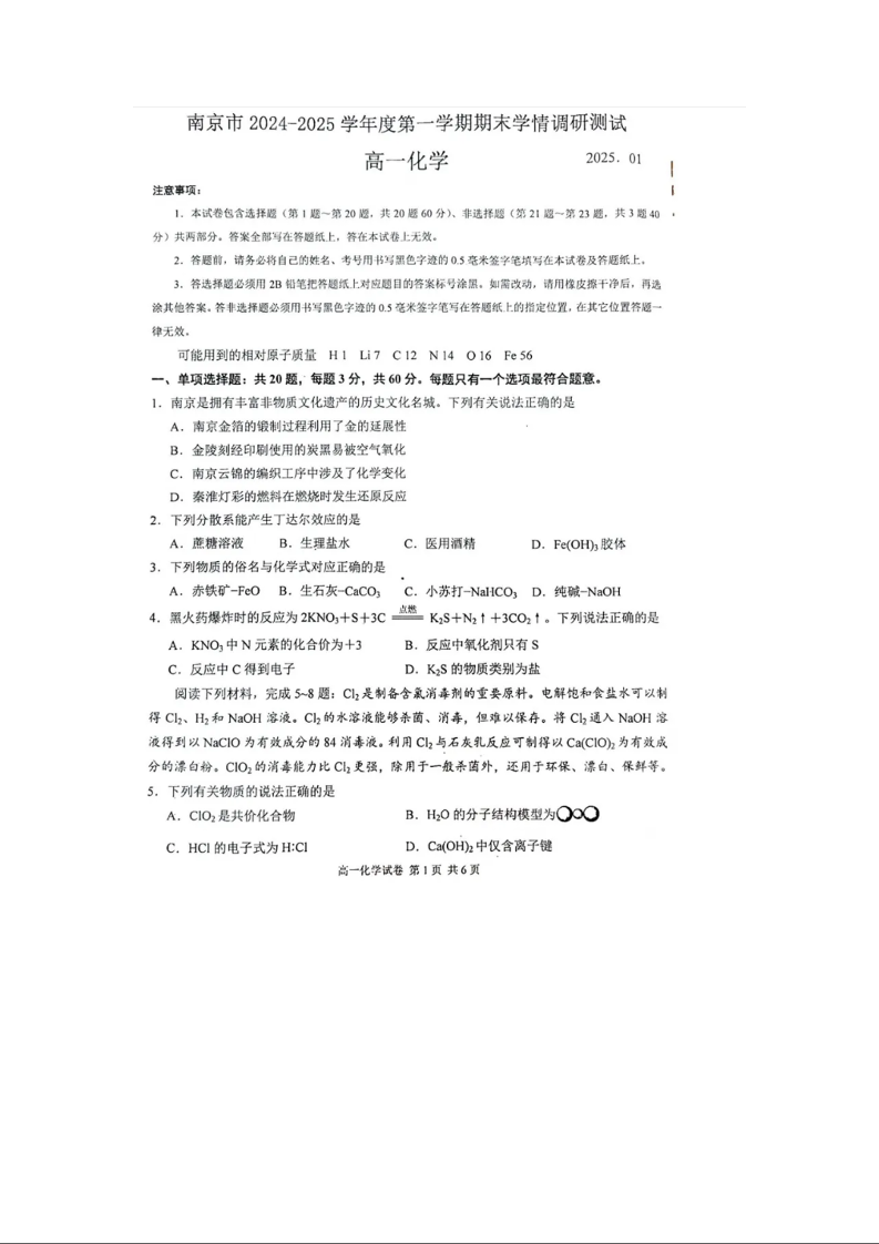 江苏省南京市2024-2025学年上学期1月高一期末考试化学+答案