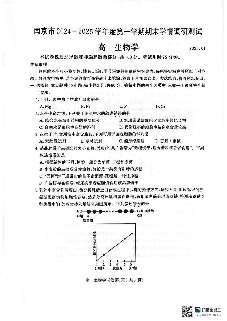 江苏省南京市2024-2025学年上学期1月高一期末考试生物