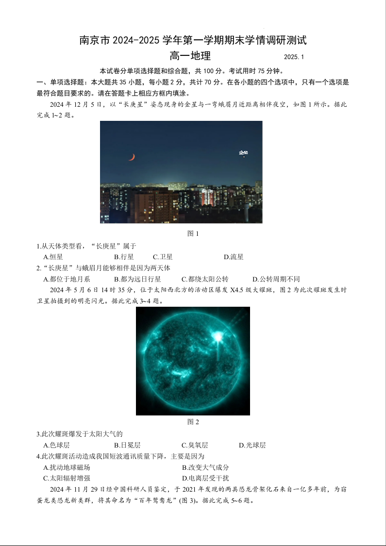 江苏省南京市2024-2025学年上学期1月高一期末考试地理