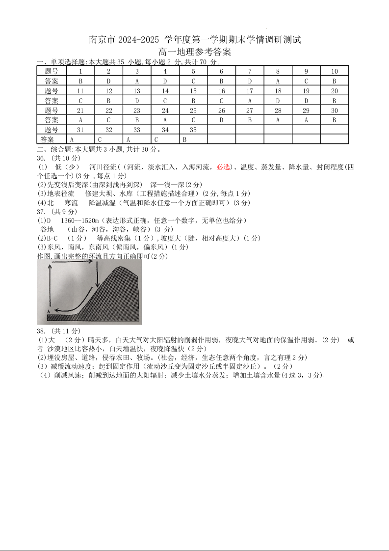 江苏省南京市2024-2025学年上学期1月高一期末考试地理答案