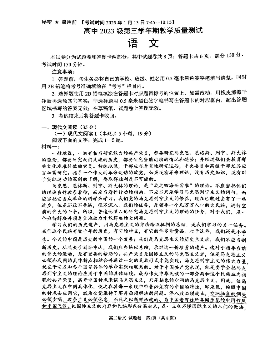 四川省绵阳市2024-2025学年上学期1月高二期末考试语文