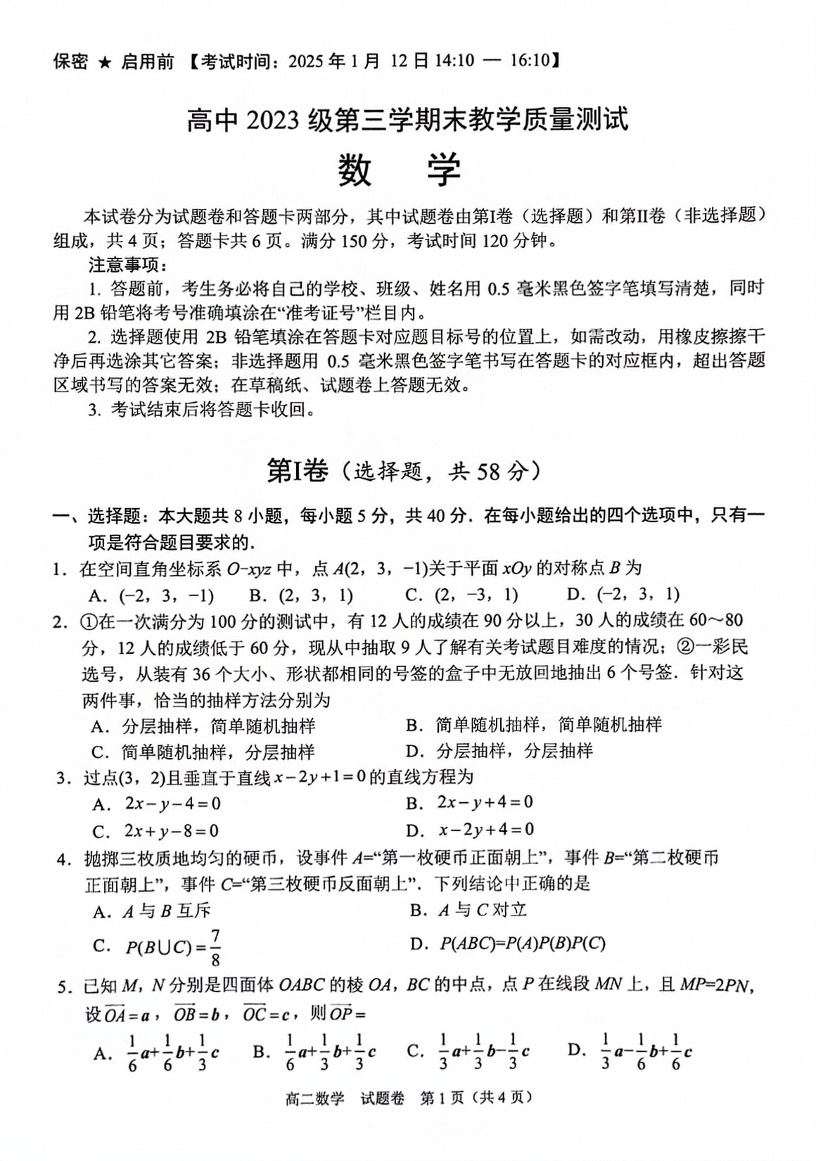 四川省绵阳市2024-2025学年上学期1月高二期末考试数学