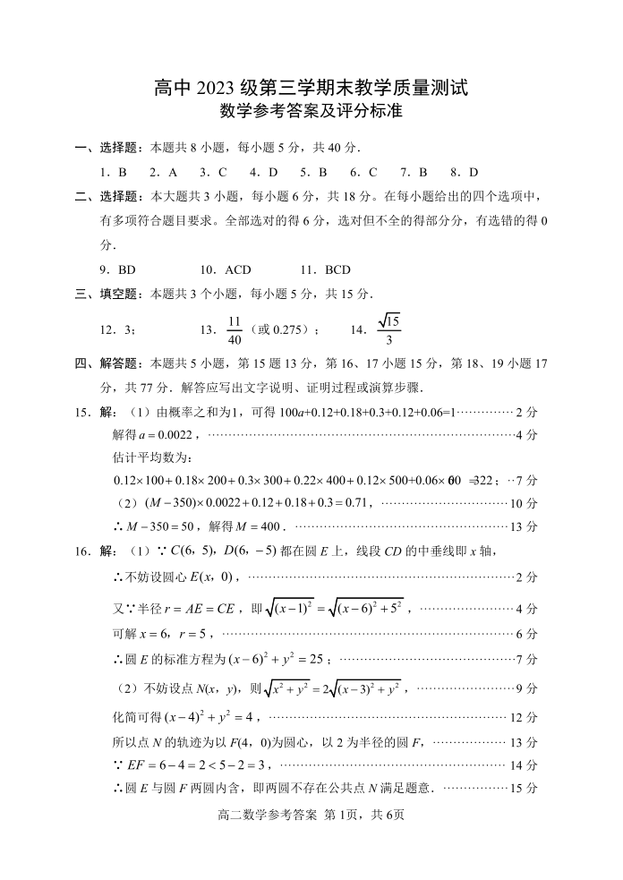 四川省绵阳市2024-2025学年上学期1月高二期末考试数学答案