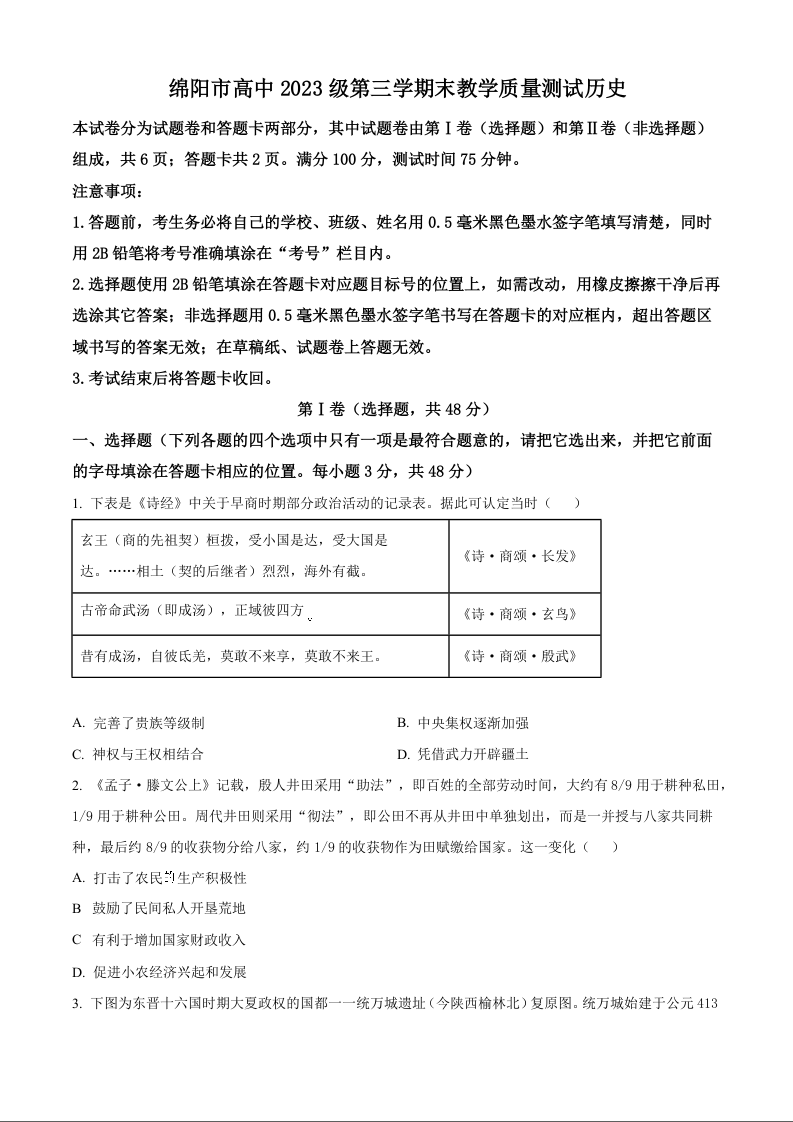 四川省绵阳市2024-2025学年上学期1月高二期末考试历史(原卷版)