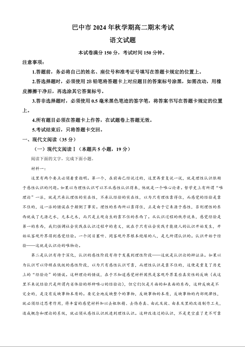 四川省巴中市2024-2025学年上学期1月高二期末考试语文(精品解析版)
