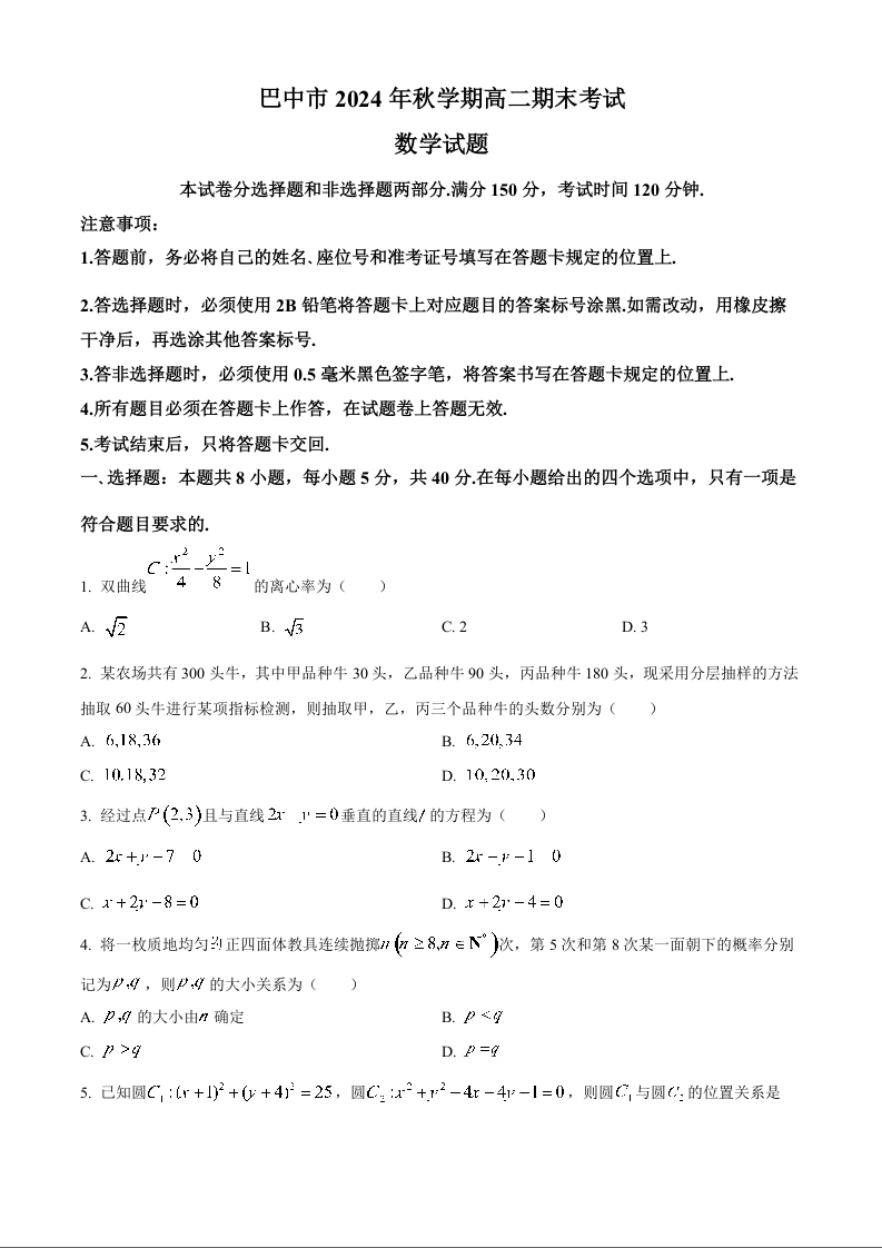 四川省巴中市2024-2025学年上学期1月高二期末考试数学(原卷版)