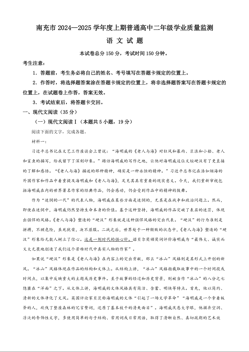 四川省南充市2024-2025学年上学期1月高二期末检测语文(精品解析版)