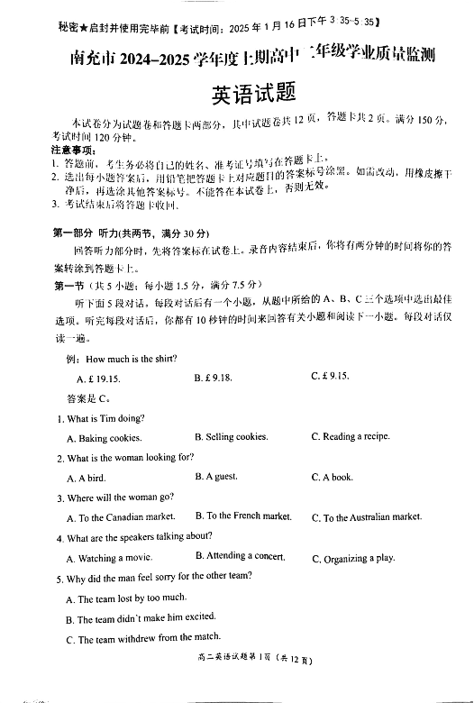 四川省南充市2024-2025学年上学期1月高二期末检测英语