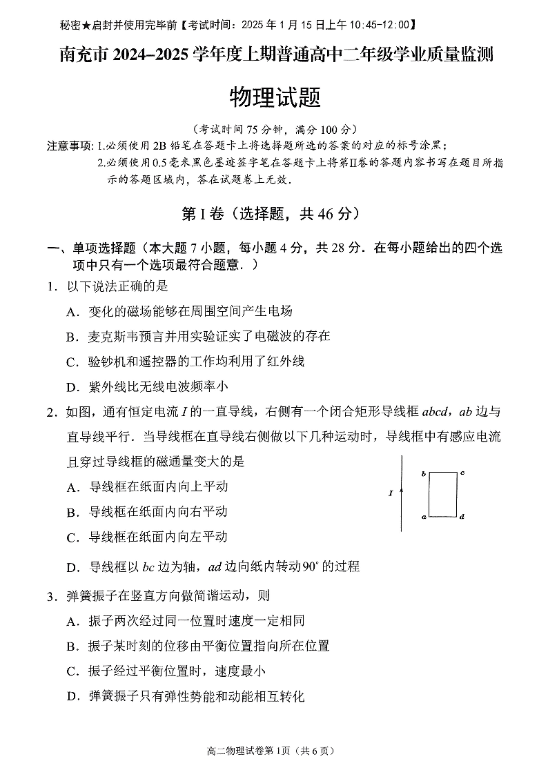 四川省南充市2024-2025学年上学期1月高二期末检测物理