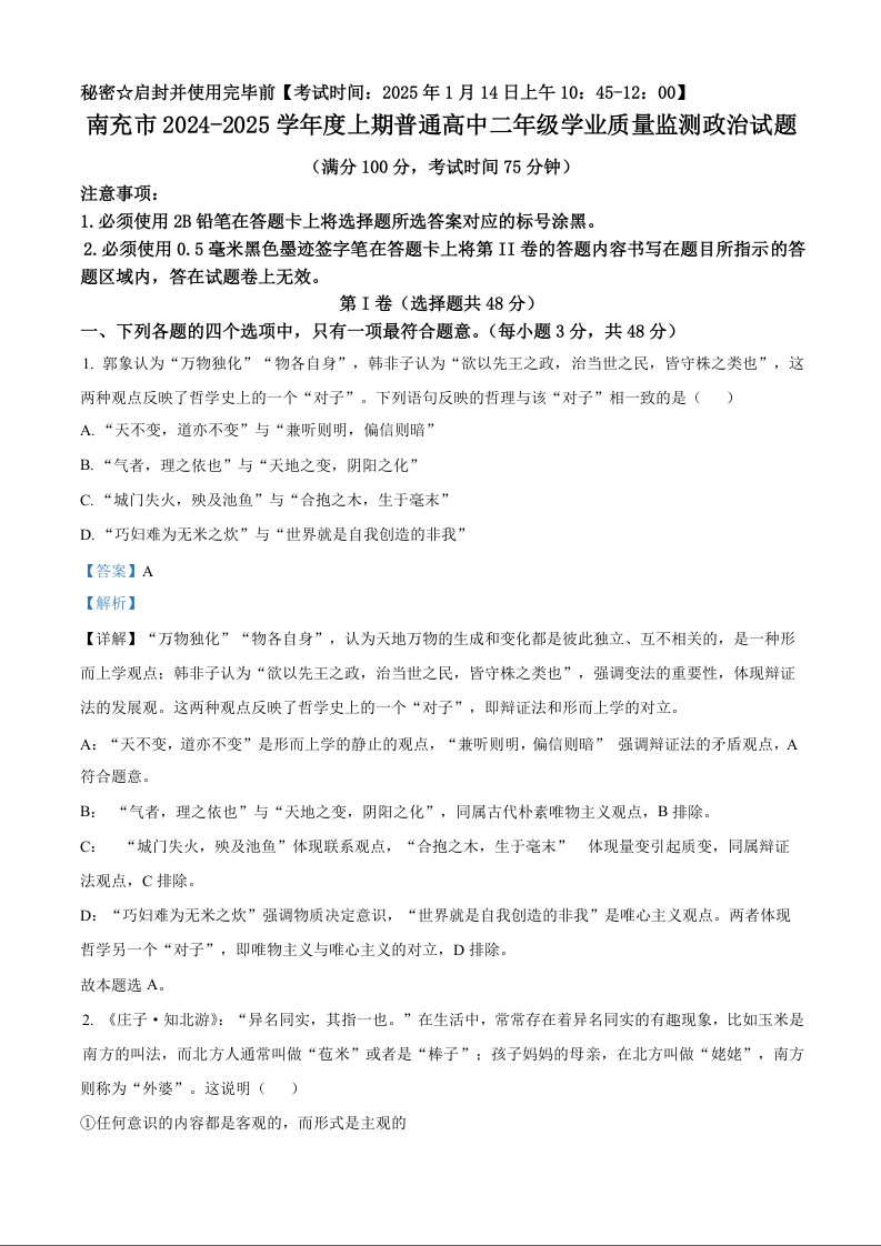 四川省南充市2024-2025学年上学期1月高二期末检测政治(精品解析版)