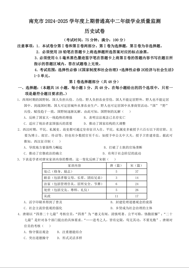 四川省南充市2024-2025学年上学期1月高二期末检测历史+答案