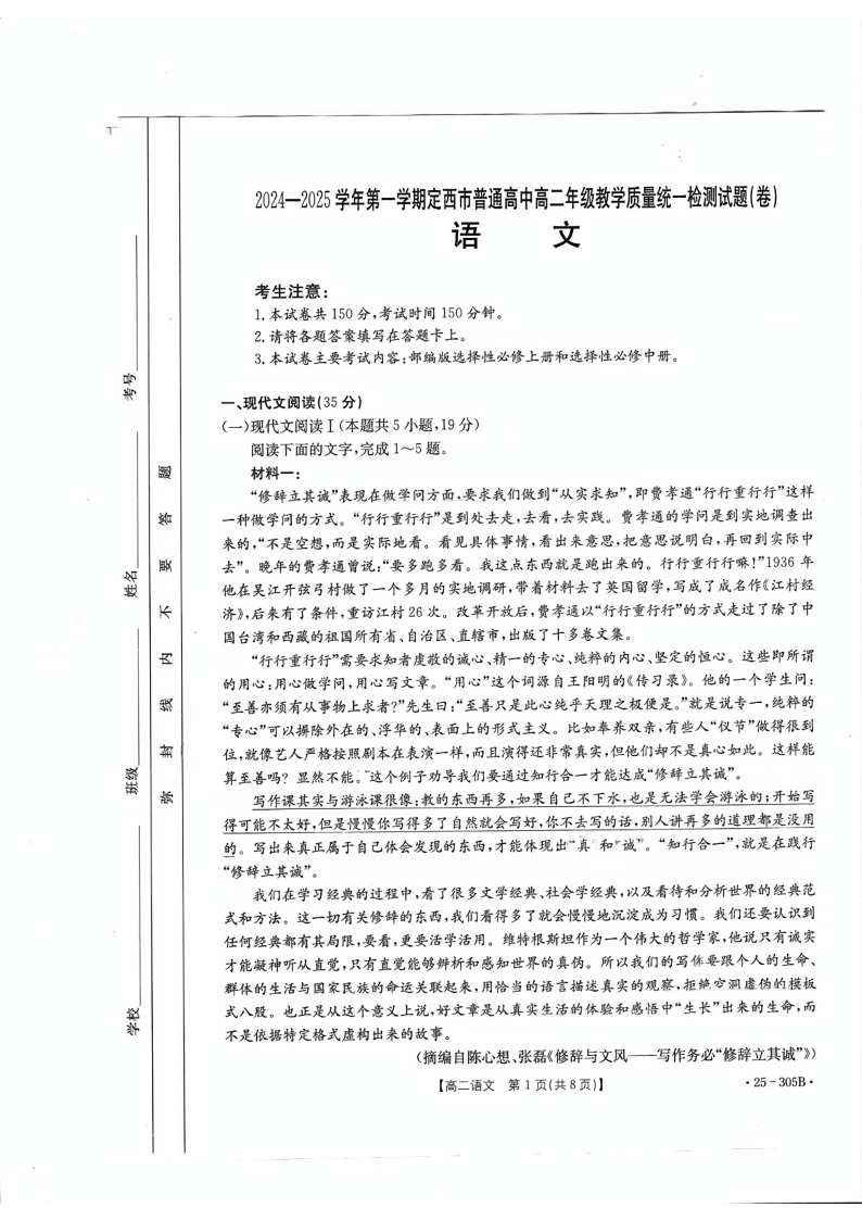 甘肃省定西市八校2024-2025学年上学期1月高二期末考试语文