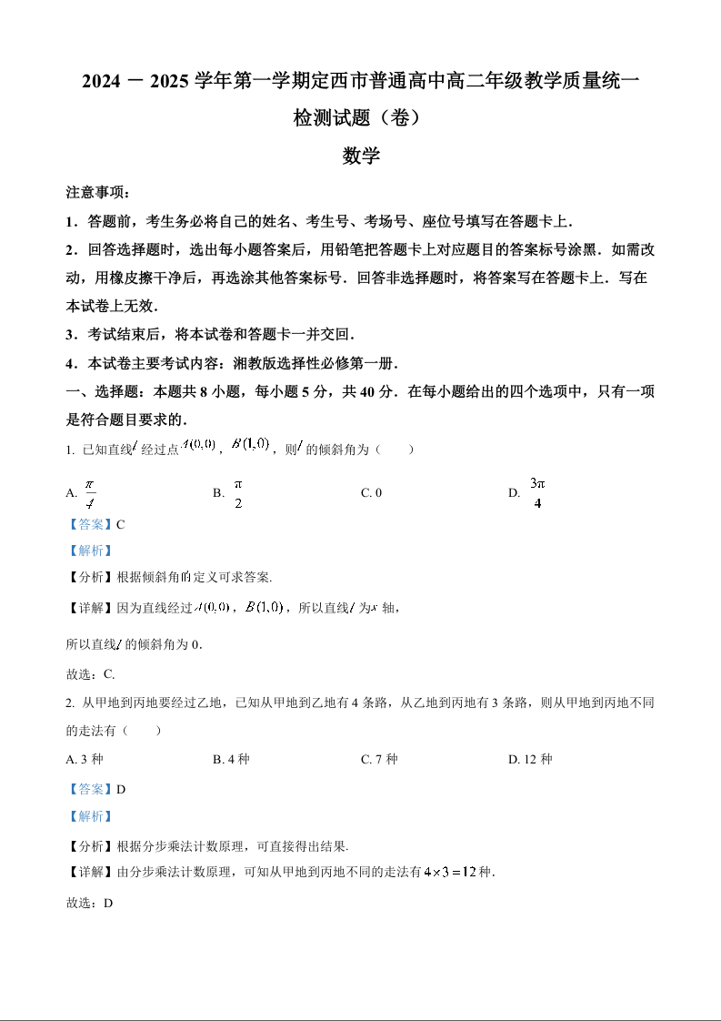 甘肃省定西市八校2024-2025学年上学期1月高二期末考试数学(解析版)