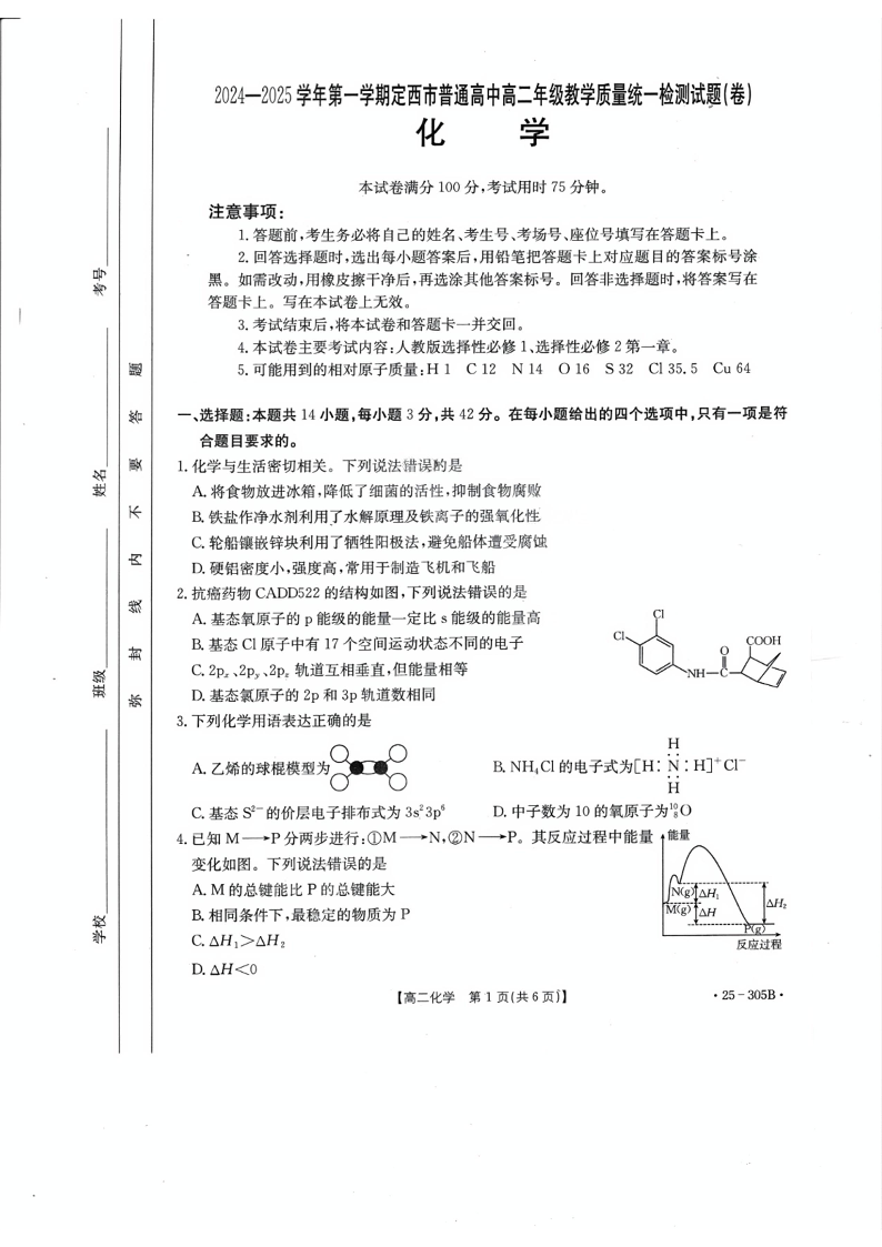 甘肃省定西市八校2024-2025学年上学期1月高二期末考试化学