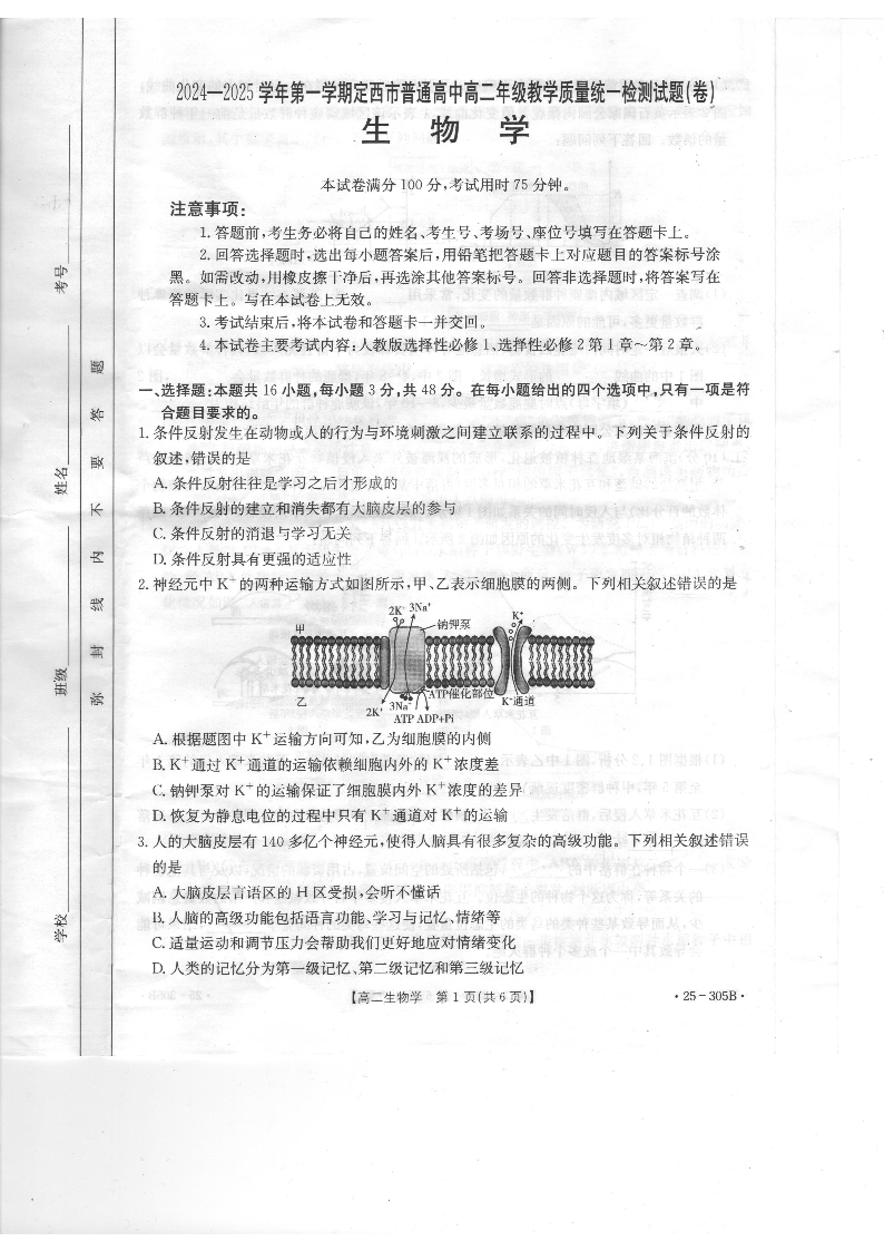 甘肃省定西市八校2024-2025学年上学期1月高二期末考试生物