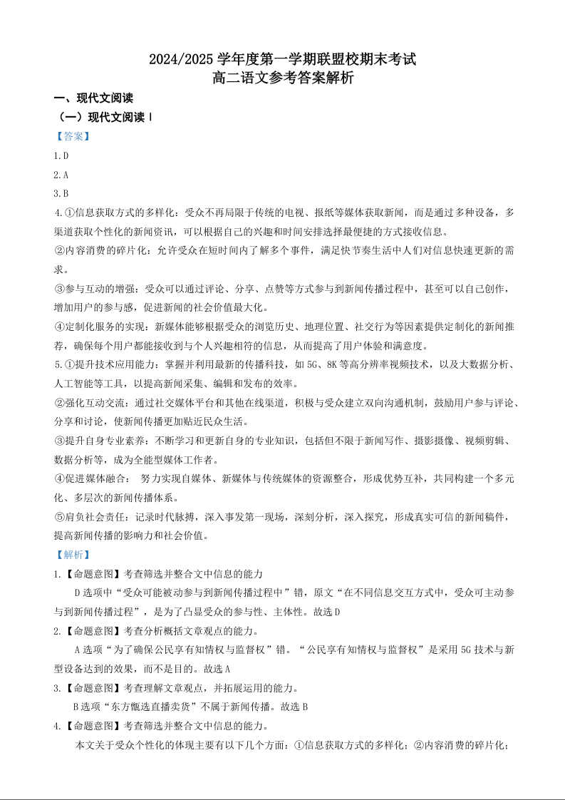 江苏省盐城市五校2024-2025学年上学期1月高二期末联考语文答案