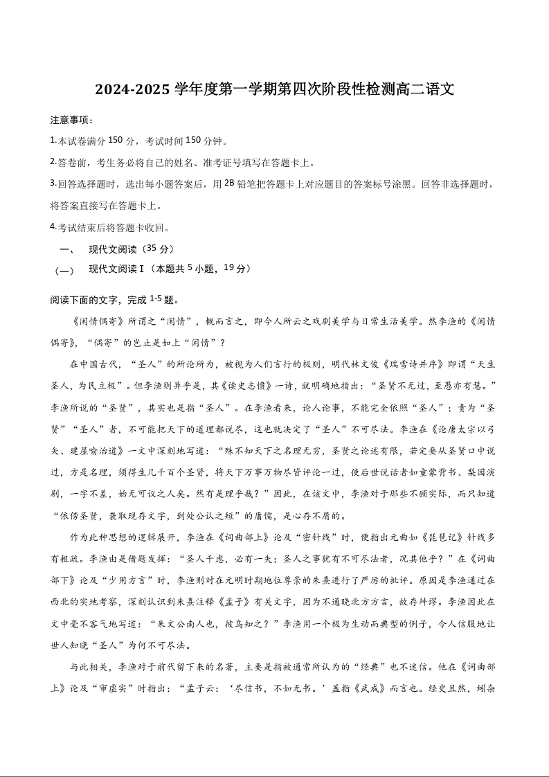 陕西省西安市区域2024-2025学年上学期高二第四次阶段性检测语文+答案