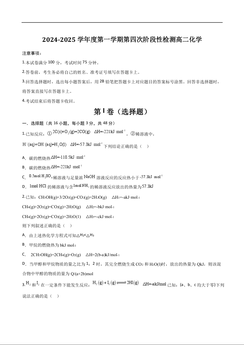 陕西省西安市区域2024-2025学年上学期高二第四次阶段性检测化学+答案