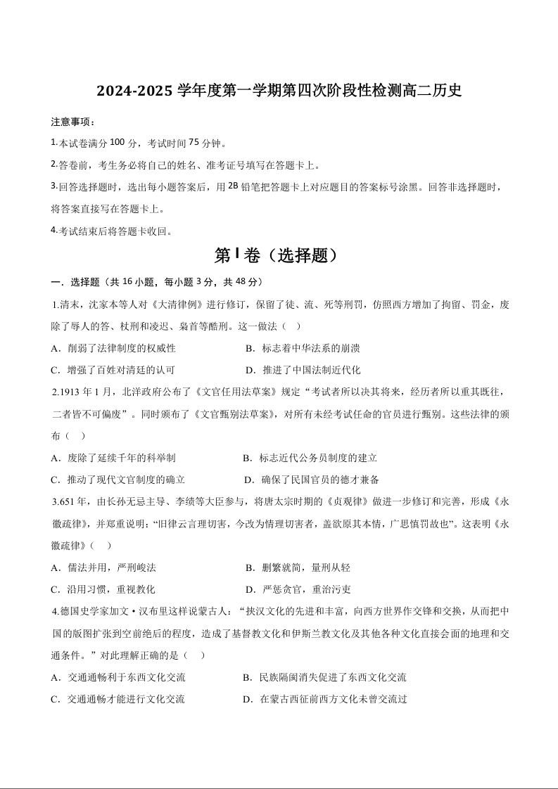 陕西省西安市区域2024-2025学年上学期高二第四次阶段性检测历史+答案