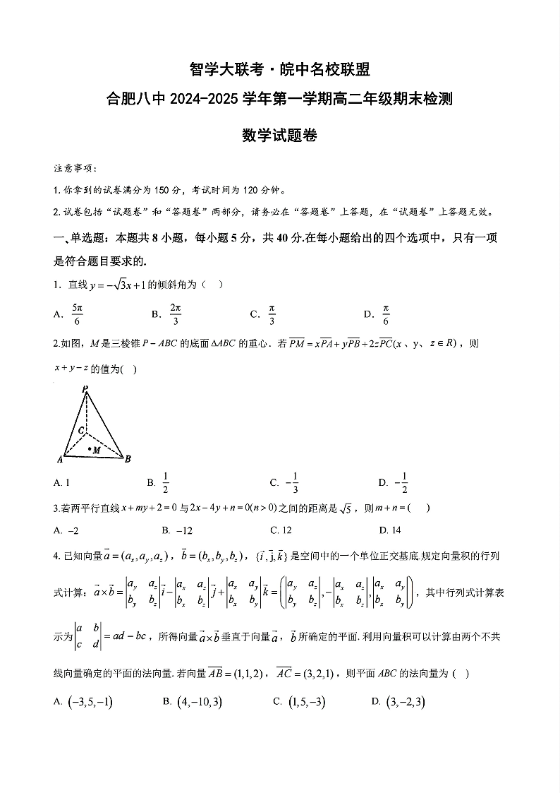 安徽省区域名校2024-2025学年上学期1月高二期末检测数学