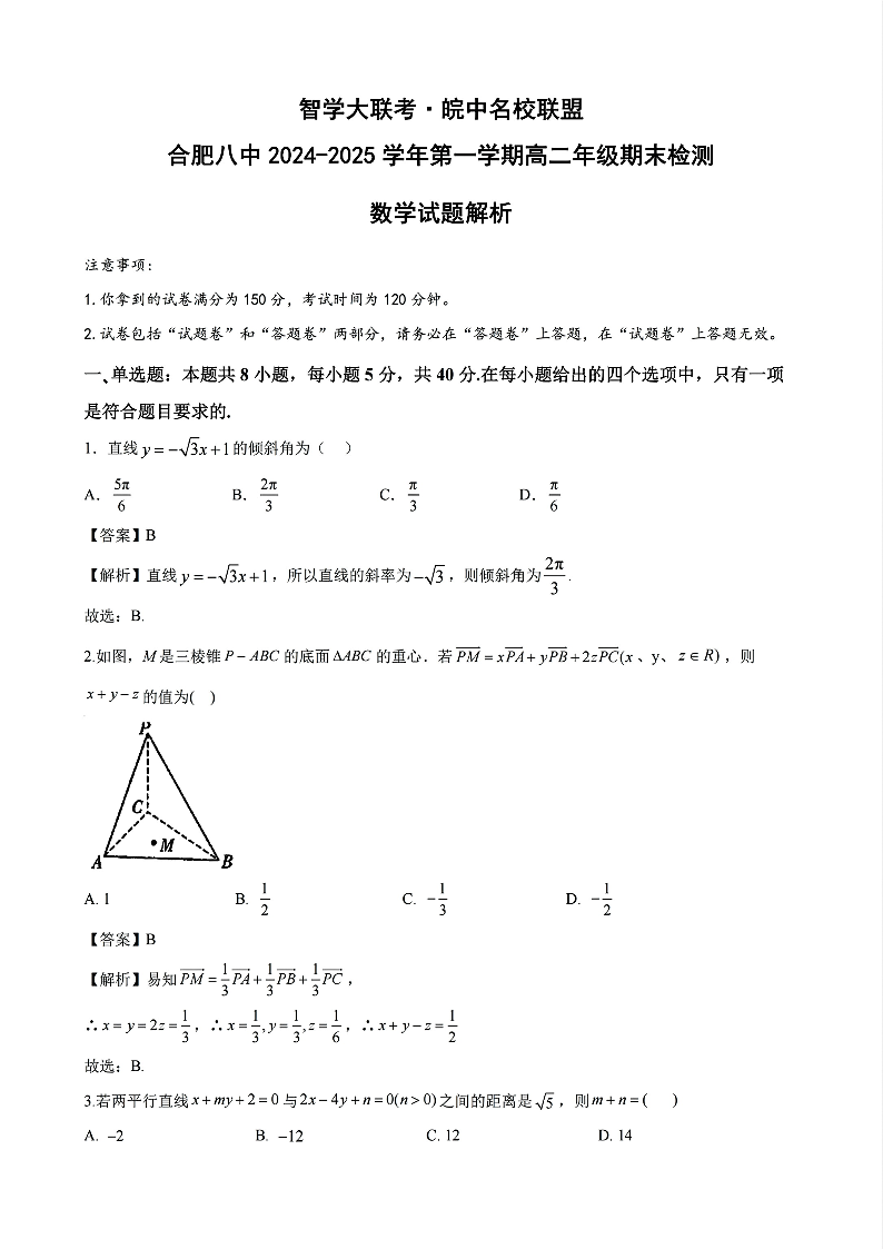 安徽省区域名校2024-2025学年上学期1月高二期末检测数学答案