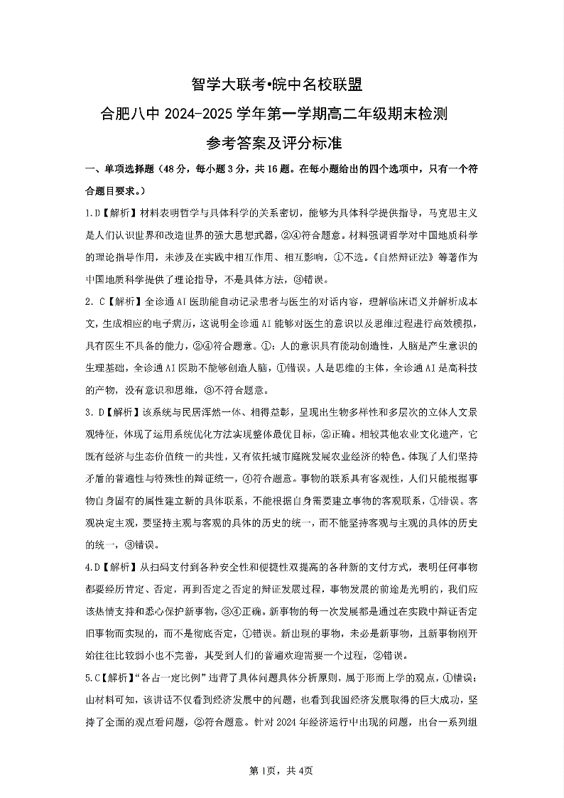 安徽省区域名校2024-2025学年上学期1月高二期末检测政治答案