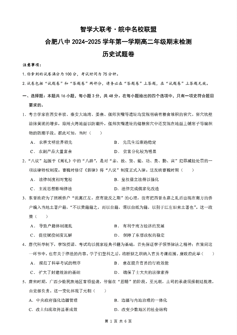 安徽省区域名校2024-2025学年上学期1月高二期末检测历史