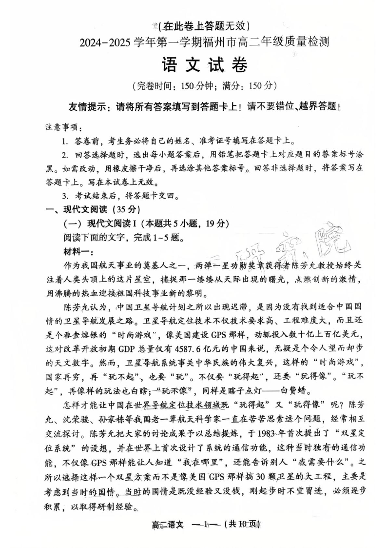 福建省福州市2024-2025学年上学期高二期末考试语文