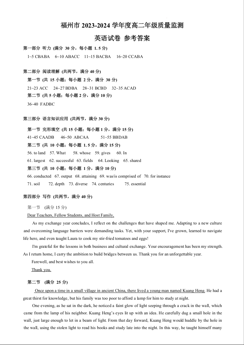 福建省福州市2024-2025学年上学期高二期末考试英语答案