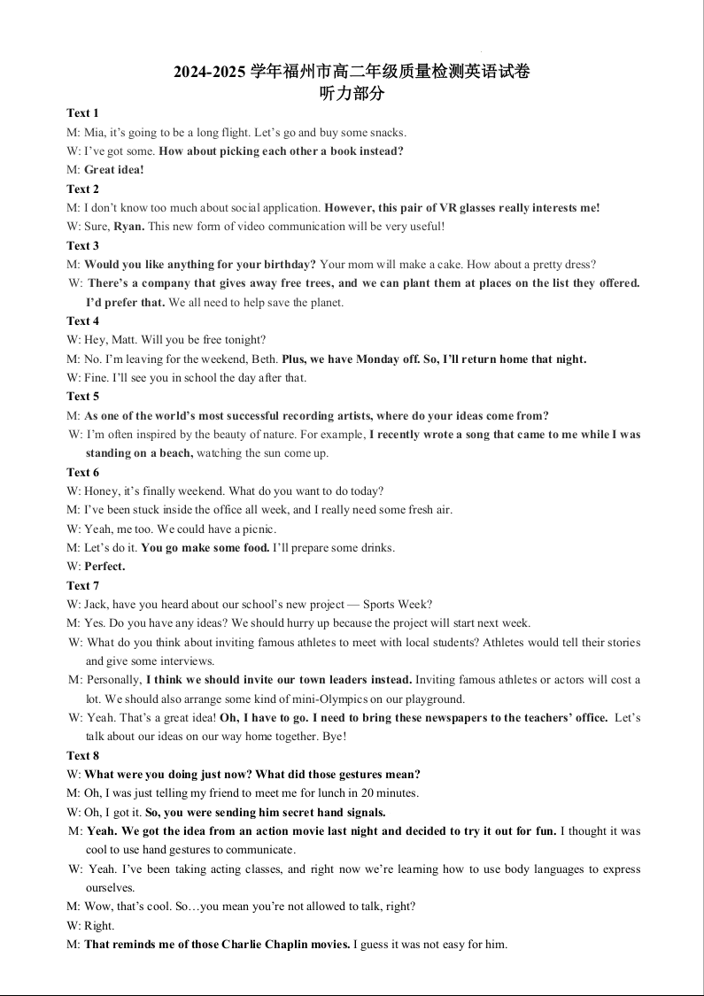 福建省福州市2024-2025学年上学期高二期末考试英语听力材料