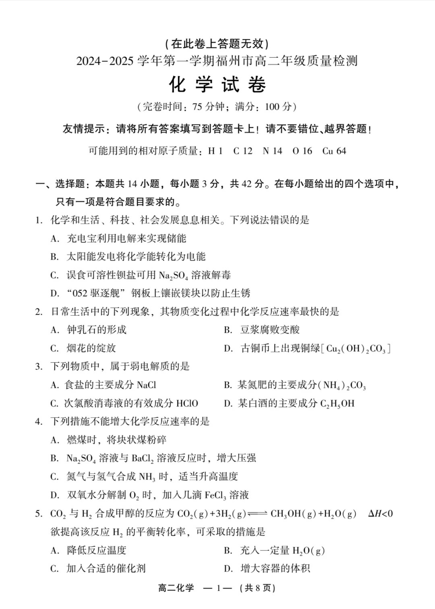 福建省福州市2024-2025学年上学期高二期末考试化学