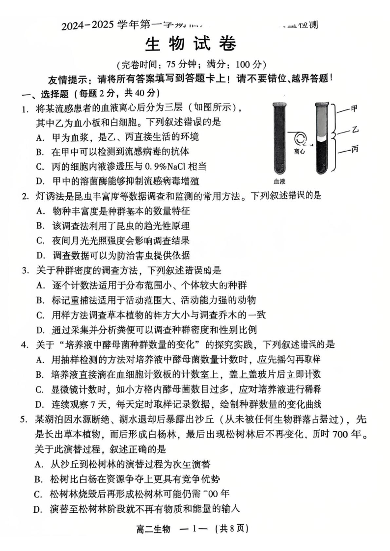 福建省福州市2024-2025学年上学期高二期末考试生物