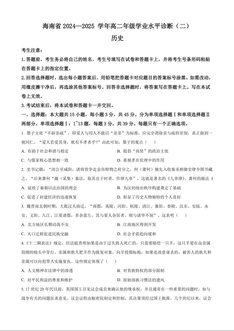 海南省多校2024-2025学年上学期1月高二期末考试历史(原卷版)