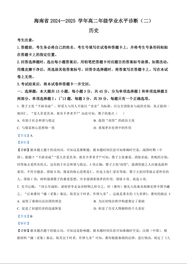 海南省多校2024-2025学年上学期1月高二期末考试历史(精品解析版)