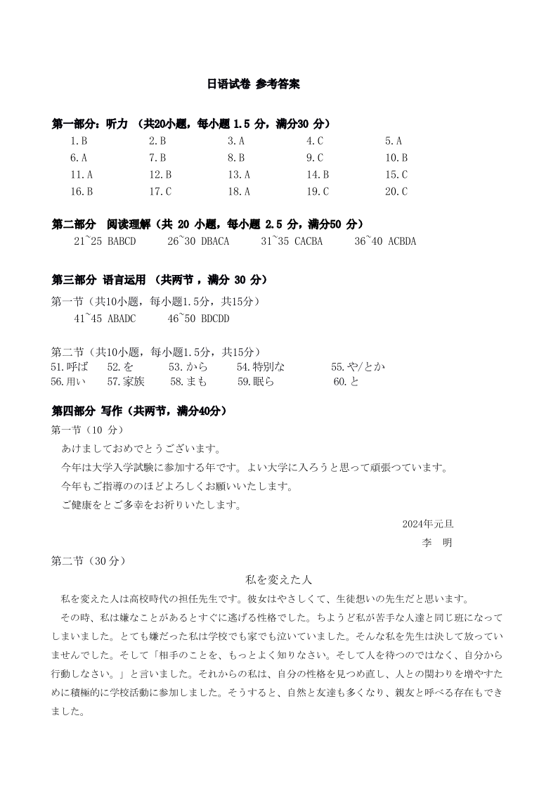 湖北省新八校协作体2025届高三下学期2月联考日语答案