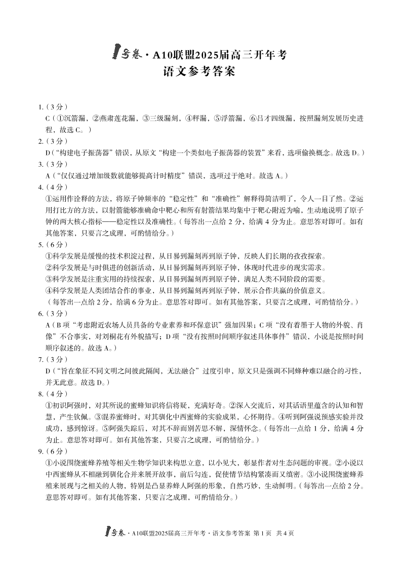 安徽省1号卷·A10联盟2025届高三下学期2月开年考语文答案