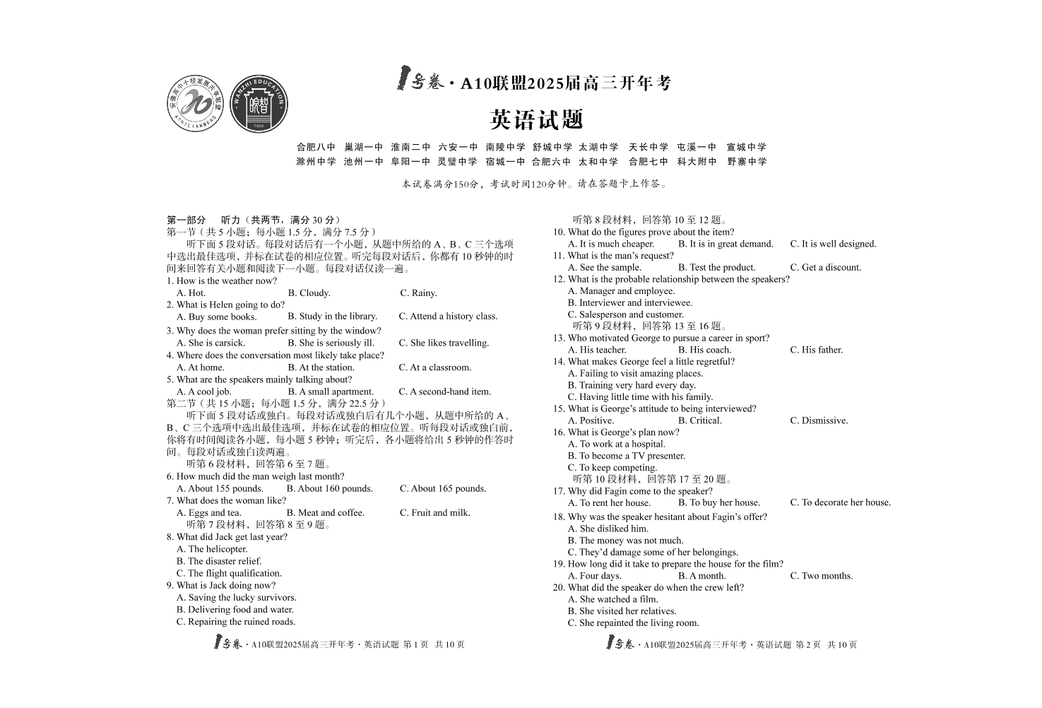 安徽省1号卷·A10联盟2025届高三下学期2月开年考英语