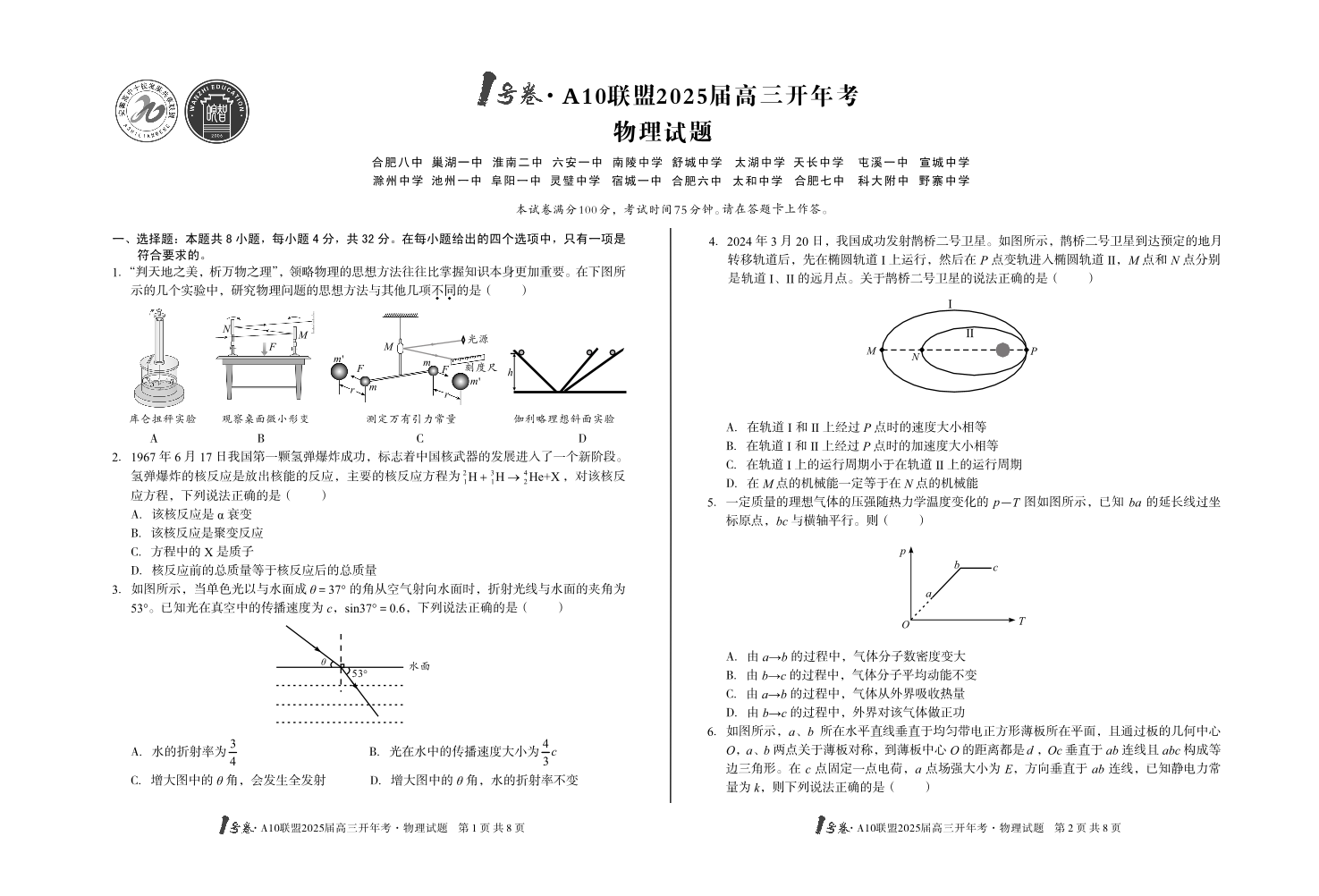 安徽省1号卷·A10联盟2025届高三下学期2月开年考物理