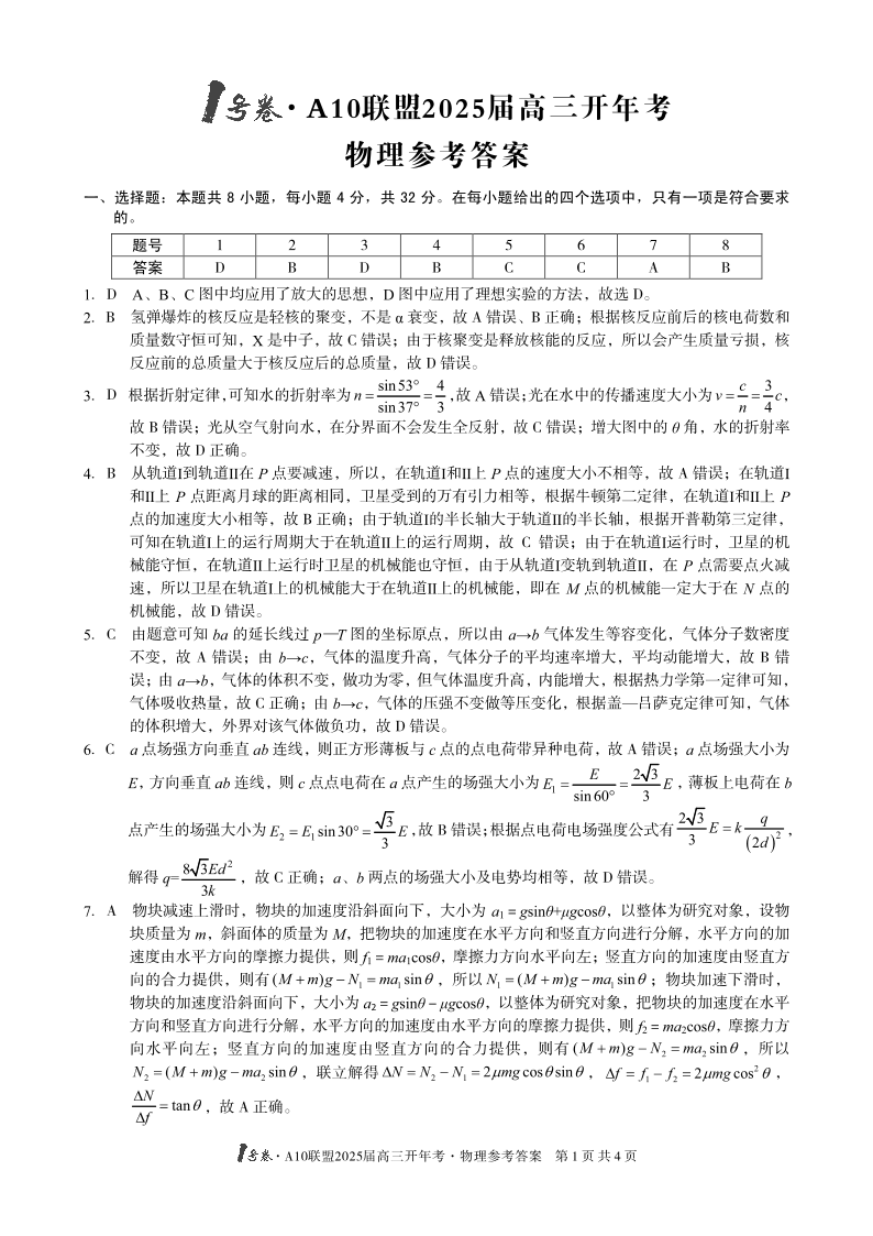 安徽省1号卷·A10联盟2025届高三下学期2月开年考物理答案