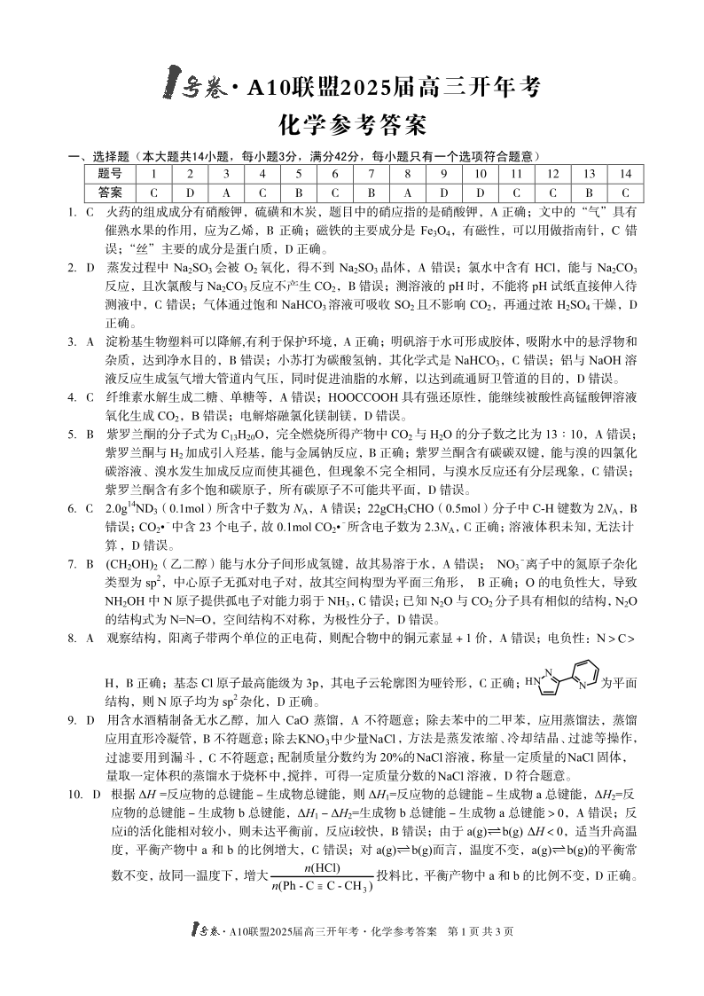 安徽省1号卷·A10联盟2025届高三下学期2月开年考化学答案