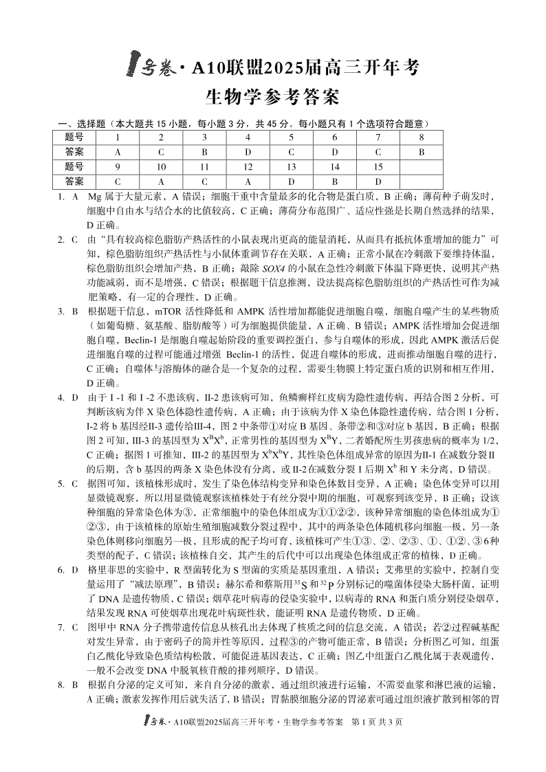 安徽省1号卷·A10联盟2025届高三下学期2月开年考生物答案
