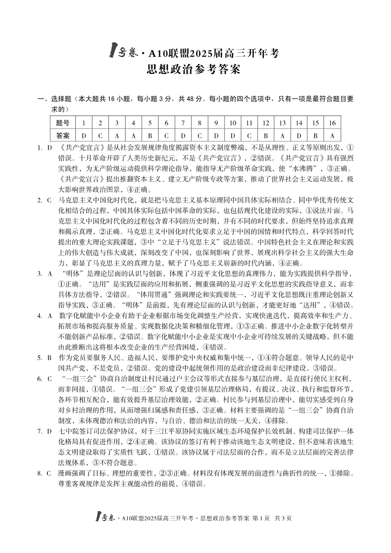 安徽省1号卷·A10联盟2025届高三下学期2月开年考政治答案