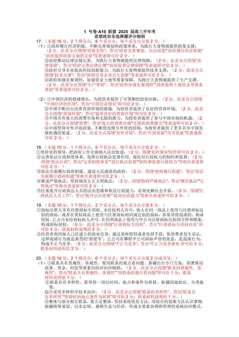 安徽省1号卷·A10联盟2025届高三下学期2月开年考政治评分细则