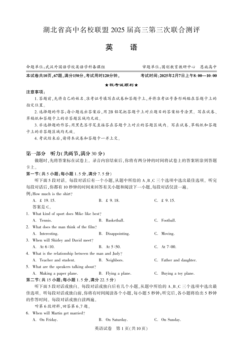 湖北省圆创高中名校联盟2025届高三第三次联合测评英语